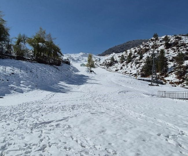 जोशीमठ/औली। उत्तराखंड के प्रसिद्ध पर्यटन स्थल औली में ताजा बर्फबारी के बाद पूरे क्षेत्र में करीब आधा फीट तक सफेद बर्फ की चादर बिछ गई है। बर्फ से ढकी वादियों ने औली की खूबसूरती को और निखार दिया है, जिससे यहां पर्यटकों की भारी भीड़ उमड़ पड़ी है।