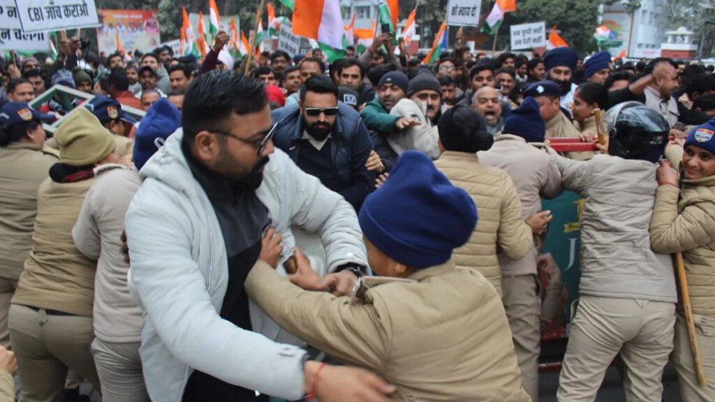 रुद्रपुर। अंकिता भंडारी प्रकरण में वीआईपी नेताओं के खिलाफ कार्रवाई और सीबीआई जांच की मांग को लेकर कांग्रेसियों ने शनिवार को जिला मुख्यालय पर जोरदार प्रदर्शन के साथ कलेक्ट्रेट कूच किया। इस दौरान जमकर हंगामा हुआ और पुलिस से नोक झोंक हुई भारी विरोध के साथ कांग्रेसियों ने पुलिस से भिड़ते हुए बैरिकेटिंग तोड़कर कलेक्ट्रेट में प्रवेश कर जोरदार नारेबाजी की।